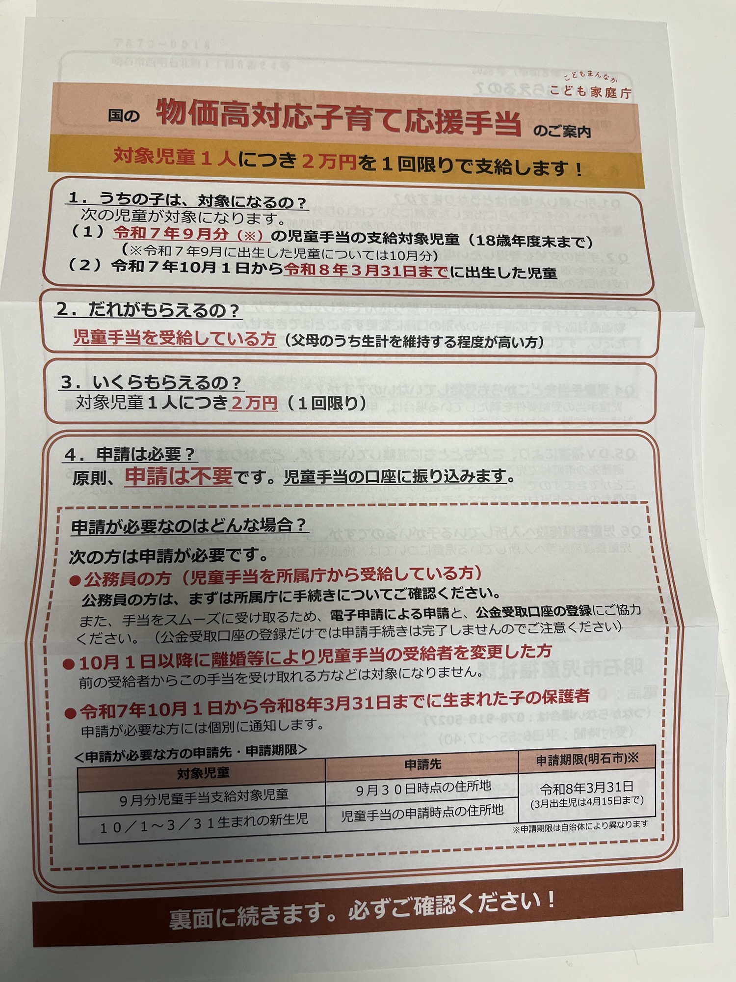 先日、『物価高対応子育て応援手当』のお知らせが届きましたー‼️